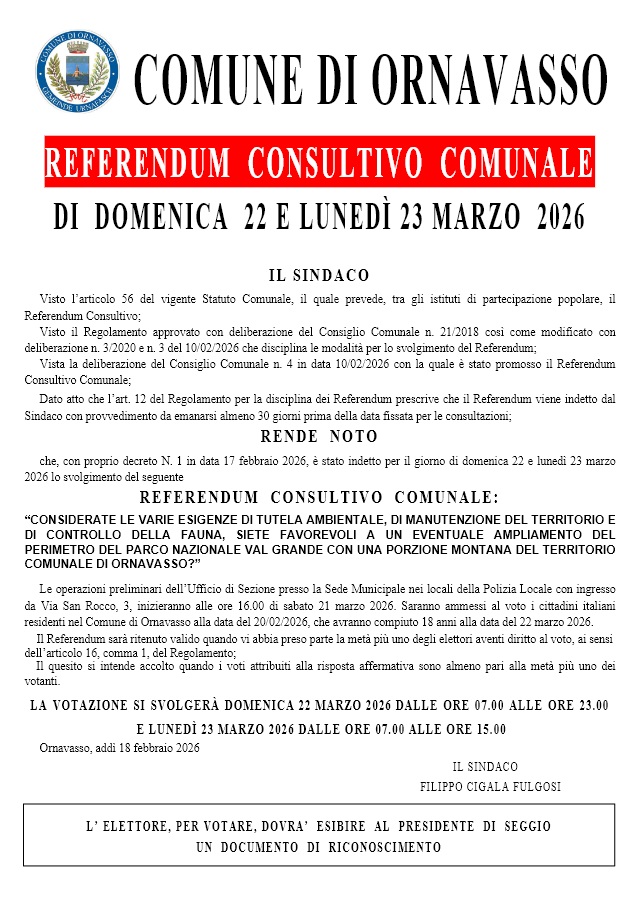 residenti nel Comune di Ornavasso alla data del 20/02/2026, che avranno compiuto 18 anni alla data del 22 marzo 2026.