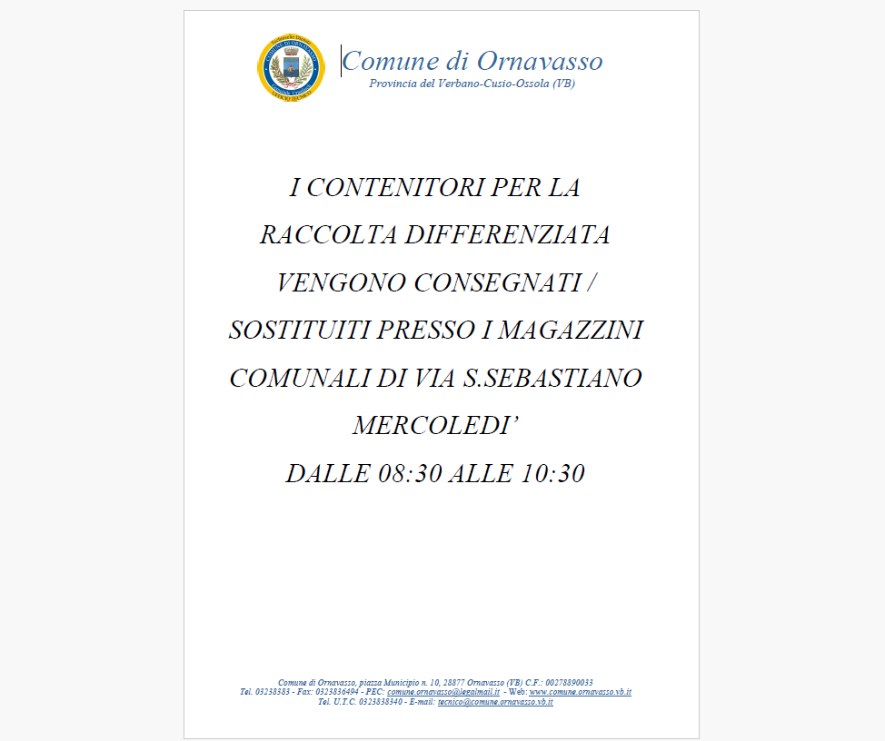 i contenitori per la raccolta differenziata vengono consegnati / sostituiti presso i magazzini comunali di via S. Sebastiano mercoledi’ dalle 08:30 alle 10:30