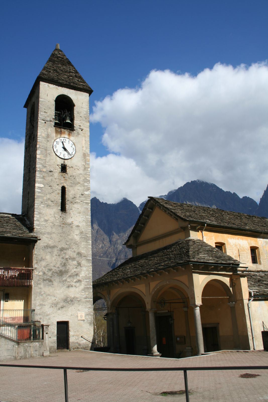 Chiesa a pianta rettangolare a tre navate, quella centrale absidata, preceduta da un portico atre arcate, affiancata da una sacrestia con bellissimo mobilio e dal campanile con copertura a cuspide in piode.